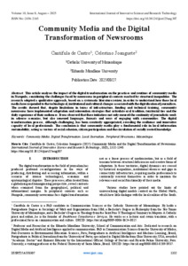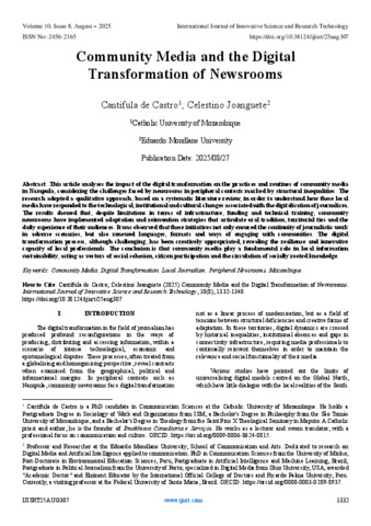 de Castro, Cantífula and Joanguete, Celestino (2025) Community Media and the Digital Transformation of Newsrooms. International Journal of Innovative Science and Research Technology, 10 (8): 25aug307. pp. 1332-1340. ISSN 2456-2165