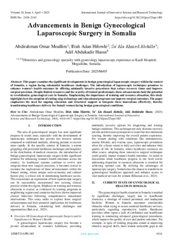Omar Moallim, Abdirahman and Hilowle, Ifrah Adan and Abdulle, Sa’Ala Ahmed and Hassn, Adil Abdukadir (2025) Advancements in Benign Gynecological Laparoscopic Surgery in Somalia. International Journal of Innovative Science and Research Technology, 10 (4): 25apr1485. pp. 4416-4417. ISSN 2456-2165