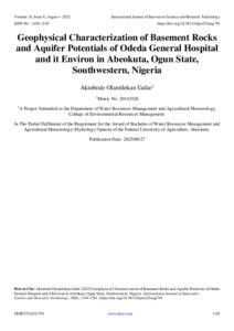 Olamilekan Gafar, Akinbode (2025) Geophysical Characterization of Basement Rocks and Aquifer Potentials of Odeda General Hospital and it Environ in Abeokuta, Ogun State, Southwestern, Nigeria. International Journal of Innovative Science and Research Technology, 10 (8): 25aug794. pp. 1344-1381. ISSN 2456-2165