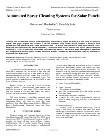 Hasaballah, Mohammed and Zarie, Abdullah (2025) Automated Spray Cleaning Systems for Solar Panels. International Journal of Innovative Science and Research Technology, 10 (8): 25aug1017. pp. 1415-1416. ISSN 2456-2165