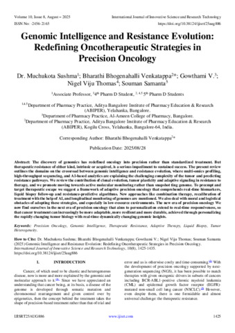 Sushma, Dr. Muchukota and Bhogenahalli Venkatappa, Bharathi and V., Gowthami and Viju Thomas, Nigel and Samanta, Souman (2025) Genomic Intelligence and Resistance Evolution: Redefining Oncotherapeutic Strategies in Precision Oncology. International Journal of Innovative Science and Research Technology, 10 (8): 25aug886. pp. 1425-1435. ISSN 2456-2165