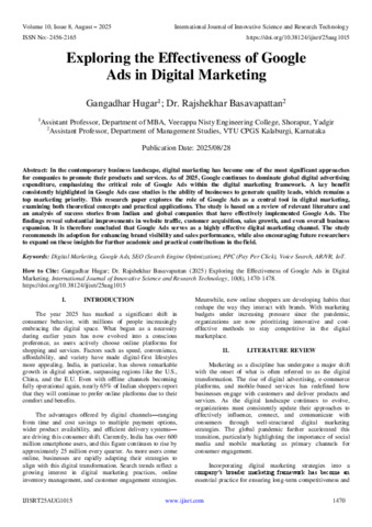 Hugar, Gangadhar and Basavapattan, Rajshekhar (2025) Exploring the Effectiveness of Google Ads in Digital Marketing. International Journal of Innovative Science and Research Technology, 10 (8): 25aug1015. pp. 1470-1478. ISSN 2456-2165