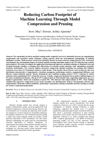 May, Stow, and Ashley Ajumoke, Stewart, (2025) Reducing Carbon Footprint of Machine Learning Through Model Compression and Pruning. International Journal of Innovative Science and Research Technology, 10 (8): 25aug970. pp. 1479-1503. ISSN 2456-2165