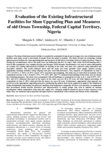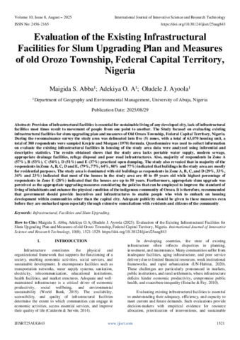 S. Abba, Maigida and O. A, Adekiya and J. Ayoola, Oludele (2025) Evaluation of the Existing Infrastructural Facilities for Slum Upgrading Plan and Measures of old Orozo Township, Federal Capital Territory, Nigeria. International Journal of Innovative Science and Research Technology, 10 (8): 25aug843. pp. 1521-1529. ISSN 2456-2165