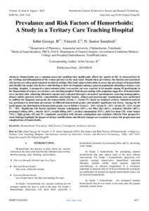 George. B, Jobin and C, Viniesh . and Sundresh, N. Junior (2025) Prevalance and Risk Factors of Hemorrhoids: A Study in a Teritary Care Teaching Hospital. International Journal of Innovative Science and Research Technology, 10 (8): 25aug991. pp. 1627-1635. ISSN 2456-2165