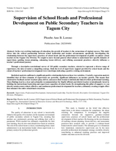Lorono, Phoebe Ann B. (2025) Supervision of School Heads and Professional Development on Public Secondary Teachers in Tagum City. International Journal of Innovative Science and Research Technology, 10 (8): 25aug1174. pp. 1717-1718. ISSN 2456-2165