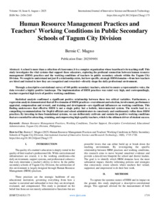 Magno, Bernie C. (2025) Human Resource Management Practices and Teachers' Working Conditions in Public Secondary Schools of Tagum City Division. International Journal of Innovative Science and Research Technology, 10 (8): 25aug1175. pp. 1719-1720. ISSN 2456-2165