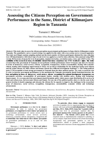 Mbonea, Tumaini J. (2025) Assessing the Citizens Perception on Government Performance in the Same, District of Kilimanjaro Region in Tanzania. International Journal of Innovative Science and Research Technology, 10 (8): 25aug824. pp. 2894-2908. ISSN 2456-2165