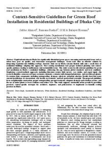 Ahmed, Sabbir and Rashid, Rumana and Hossain, G M A Balayet (2025) Context-Sensitive Guidelines for Green Roof Installation in Residential Buildings of Dhaka City. International Journal of Innovative Science and Research Technology, 10 (9): 25sep302. pp. 231-243. ISSN 2456-2165