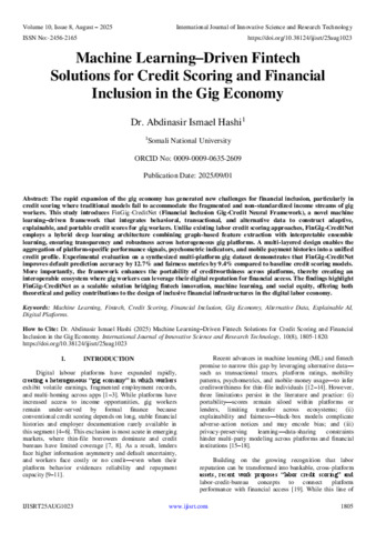 Ismael Hashi, Dr. Abdinasir (2025) Machine Learning–Driven Fintech Solutions for Credit Scoring and Financial Inclusion in the Gig Economy. International Journal of Innovative Science and Research Technology, 10 (8): 25aug1023. pp. 1805-1820. ISSN 2456-2165