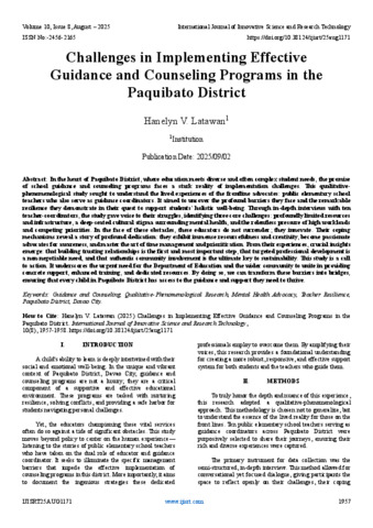 V. Latawan, Hanelyn (2025) Challenges in Implementing Effective Guidance and Counseling Programs in the Paquibato District. International Journal of Innovative Science and Research Technology, 10 (8): 25aug1171. pp. 1957-1958. ISSN 2456-2165