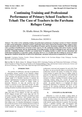 Ahmat, Dr. Khalla and Daouda, Dr. Maingari (2025) Continuing Training and Professional Performance of Primary School Teachers in Tchad: The Case of Teachers in the Farchana Refugee Camp. International Journal of Innovative Science and Research Technology, 10 (3): 25mar1144. pp. 3334-3340. ISSN 2456-2165