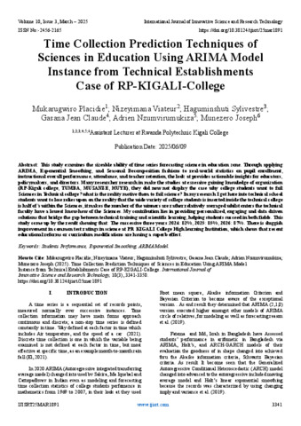 Placidie, Mukarugwiro and Viateur, Nizeyimana and Sylivestre, Haguminshuti and Claude, Gasana Jean and Nzumvirumukiza, Adrien and Joseph, Munezero (2025) Time Collection Prediction Techniques of Sciences in Education Using ARIMA Model Instance from Technical Establishments Case of RP-KIGALI-College. International Journal of Innovative Science and Research Technology, 10 (3): 25mar1891. pp. 3341-3350. ISSN 2456-2165