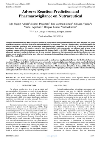 Ansari, Mo Wahib and Prajapati, Manoj and Singh, Raj Vardhan and Yadav, Shivam and Agrahari, Vishal and Vishwakarma, Deepak Kumar (2025) Adverse Reaction Prediction and Pharmacovigilance on Nutraceutical. International Journal of Innovative Science and Research Technology, 10 (3): 25mar621. pp. 3377-3383. ISSN 2456-2165