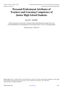 Abadilla, Jayzel E. (2025) Personal-Professional Attributes of Teachers and Learning Competence of Junior High School Students. International Journal of Innovative Science and Research Technology, 10 (3): 25mar1680. pp. 3405-3432. ISSN 2456-2165