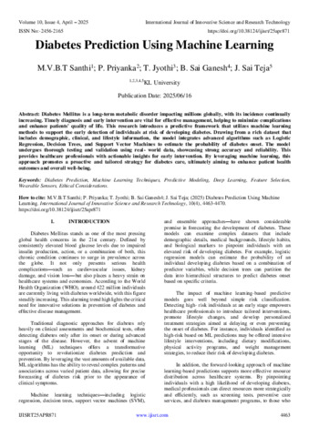 Santhi, M.V.B.T and Priyanka, P. and Jyothi, T. and Ganesh, B. Sai and Teja, J. Sai (2025) Diabetes Prediction Using Machine Learning. International Journal of Innovative Science and Research Technology, 10 (4): 25apr871. pp. 4463-4470. ISSN 2456-2165
