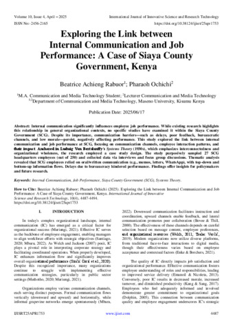 Achieng Rabuor, Beatrice and Ochichi, Pharaoh (2025) Exploring the Link between Internal Communication and Job Performance: A Case of Siaya County Government, Kenya. International Journal of Innovative Science and Research Technology, 10 (4): 25apr1753. pp. 4487-4494. ISSN 2456-2165