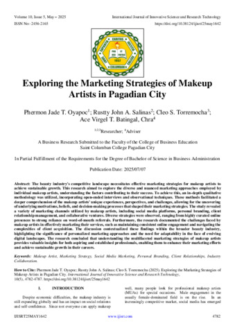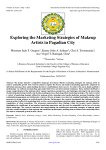 Oyapoc, Phermon Jade T. and Salinas, Rustty John A. and Torremocha, Cleo S. and Chra, Ace Virgel T. Batingal, (2025) Exploring the Marketing Strategies of Makeup Artists in Pagadian City. International Journal of Innovative Science and Research Technology, 10 (5): 25may1642. pp. 4782-4787. ISSN 2456-2165