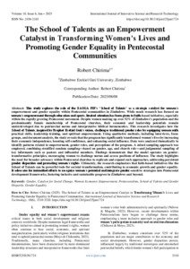 Chirima, Robert (2025) The School of Talents as an Empowerment Catalyst in Transforming Women’s Lives and Promoting Gender Equality in Pentecostal Communities. International Journal of Innovative Science and Research Technology, 10 (6): 25jun1724. pp. 3310-3320. ISSN 2456-2165
