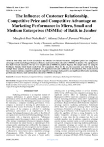 Putri Nurholisah, Maugfiroh and Suharto, Akhmad and Winahyu, Pawestri (2025) The Influence of Customer Relationship, Competitive Price and Competitive Advantage on Marketing Performance in Micro, Small and Medium Enterprises (MSMEs) of Batik in Jember. International Journal of Innovative Science and Research Technology, 10 (6): 25jun991. pp. 3338-3345. ISSN 2456-2165