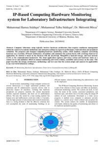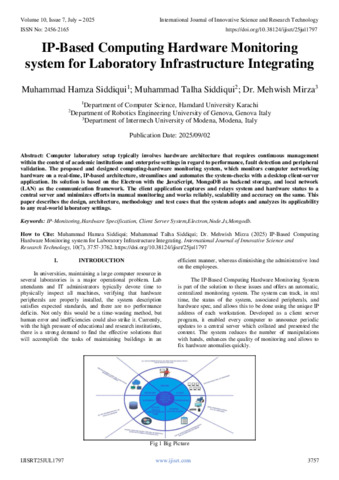 Hamza Siddiqui, Muhammad and Talha Siddiqui, Muhammad and Mirza, Mehwish (2025) IP-Based Computing Hardware Monitoring system for Laboratory Infrastructure Integrating. International Journal of Innovative Science and Research Technology, 10 (7): 25jul1797. pp. 3757-3762. ISSN 2456-2165