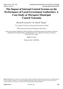 Lyawatwa, Hassan M. and Tlegray, John B. (2025) The Impact of Internal Control Systems on the Performance of Local Government Authorities: A Case Study at Morogoro Municipal Council Tanzania. International Journal of Innovative Science and Research Technology, 10 (7): 25jul533. pp. 3902-3945. ISSN 2456-2165