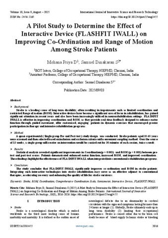 D, Mohana Priya and S, Samuel Dinakaran (2025) A Pilot Study to Determine the Effect of Interactive Device (FLASHFIT IWALL) on Improving Co-Ordination and Range of Motion Among Stroke Patients. International Journal of Innovative Science and Research Technology, 10 (8): 25aug1455. pp. 2016-2026. ISSN 2456-2165
