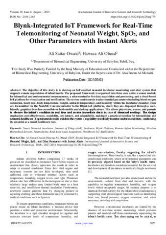 Owaid, Ali Sattar and Ali Obead, Hawraa (2025) Blynk-Integrated IoT Framework for Real-Time Telemonitoring of Neonatal Weight, SpO2, and Other Parameters with Instant Alerts. International Journal of Innovative Science and Research Technology, 10 (8): 25aug779. pp. 2027-2034. ISSN 2456-2165
