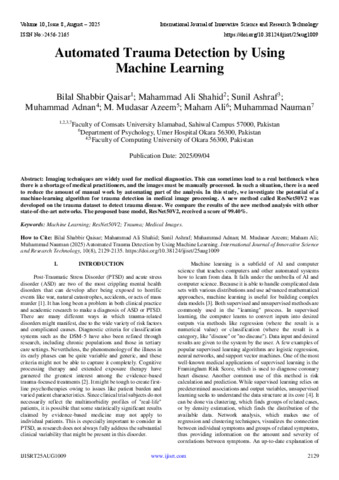 Shabbir Qaisar, Bilal and Ali Shahid, Mahammad and Ashraf, Sunil and Adnan, Muhammad and Azeem, M. Mudasar and Ali, Maham and Nauman, Muhammad (2025) Automated Trauma Detection by Using Machine Learning. International Journal of Innovative Science and Research Technology, 10 (8): 25aug1009. pp. 2129-2135. ISSN 2456-2165