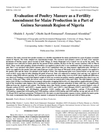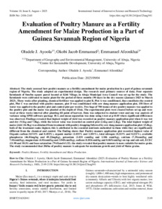 Ayoola, Oludele J. and Emmanuel, Okobi Jacob and Afeonkhai, Emmanuel (2025) Evaluation of Poultry Manure as a Fertility Amendment for Maize Production in a Part of Guinea Savannah Region of Nigeria. International Journal of Innovative Science and Research Technology, 10 (8): 25aug941. pp. 2149-2158. ISSN 2456-2165