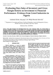 Eniola Adeyanju, Adelanke and Olawale Odewole, Dr. Philip (2025) Evaluating Days Sales of Inventory and Gross Margin Return on Investment to Financial Performance: Evidence from Listed Industries in Nigeria. International Journal of Innovative Science and Research Technology, 10 (8): 25aug1279. pp. 2159-2164. ISSN 2456-2165
