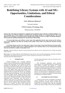 Khairnar, Atul Abhiman (2025) Redefining Library Systems with AI and ML: Opportunities, Limitations, and Ethical Considerations. International Journal of Innovative Science and Research Technology, 10 (8): 25aug1414. pp. 2180-2184. ISSN 2456-2165