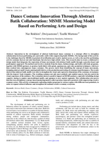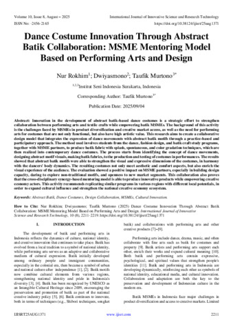Rokhim, Nur and ., Dwiyasmono and Murtono, Taufik (2025) Dance Costume Innovation Through Abstract Batik Collaboration: MSME Mentoring Model Based on Performing Arts and Design. International Journal of Innovative Science and Research Technology, 10 (8): 25aug1371. pp. 2211-2219. ISSN 2456-2165