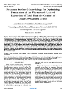 Kumar, Ankit and Malik, Neeru and Aggarwal, Amit Kumar (2025) Response Surface Methodology for Optimizing Parameters of the Ultrasound-Assisted Extraction of Total Phenolic Content of Oxalis corniculata Leaves. International Journal of Innovative Science and Research Technology, 10 (8): 25aug1070. pp. 2220-2228. ISSN 2456-2165