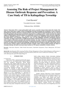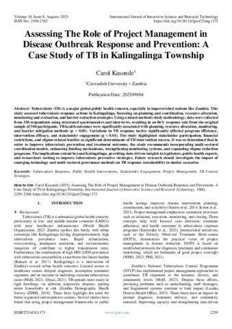 Kasonde, Carol (2025) Assessing The Role of Project Management in Disease Outbreak Response and Prevention: A Case Study of TB in Kalingalinga Township. International Journal of Innovative Science and Research Technology, 10 (8): 25aug1373. pp. 2259-2268. ISSN 2456-2165