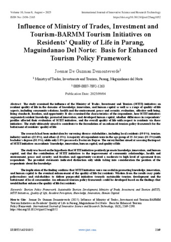 Demonteverde, Joemar De Guzman (2025) Influence of Ministry of Trades, Investment and Tourism-BARMM Tourism Initiatives on Residents' Quality of Life in Parang, Maguindanao Del Norte: Basis for Enhanced Tourism Policy Framework. International Journal of Innovative Science and Research Technology, 10 (8): 25aug1052. pp. 2269-2290. ISSN 2456-2165