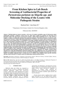 Das, Rashmi and D., Ann Irene (2025) From Kitchen Spice to Lab Bench Screening of Antibacterial Properties of Parmotrema parlatum on Shigella spp. and Molecular Docking of the Lysates with Pathogenic Strains. International Journal of Innovative Science and Research Technology, 10 (8): 25aug1452. pp. 2370-2381. ISSN 2456-2165
