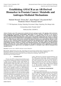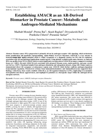 Mondal, Madhab and Rai, Prerna and Baglari, Akash and Rai, Divyadarshi and Chhetri, Pratiksha and Sarkar, Purandar (2025) Establishing AMACR as an AR-Derived Biomarker in Prostate Cancer: Metabolic and Androgen- Mediated Mechanisms. International Journal of Innovative Science and Research Technology, 10 (9): 25sep352. pp. 374-379. ISSN 2456-2165