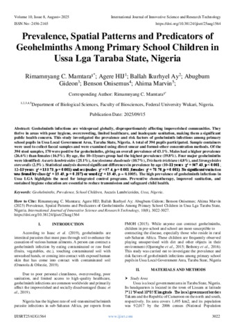 Mamtara, Rimamnyang C. and HIJ, Agere and Ay, Ballah Ikurhyel and Gideon, Abugbum and Onisemus, Benson and Marvin, Ahima (2025) Prevalence, Spatial Patterns and Predicators of Geohelminths Among Primary School Children in Ussa Lga Taraba State, Nigeria. International Journal of Innovative Science and Research Technology, 10 (8): 25aug1564. pp. 3022-3027. ISSN 2456-2165