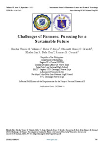 Valiente, Kiesha Venice G. and Alejo, Kobe V. and Grande, Chieneth Grace C. and Cruz, Khalex Jan R. Dela and Coronel, Romarc B. (2025) Challenges of Farmers: Pursuing for a Sustainable Future. International Journal of Innovative Science and Research Technology, 10 (9): 25sep338. pp. 795-821. ISSN 2456-2165