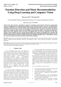 B N, Kavnaa and K P, Preethi (2025) Emotion Detection and Music Recommendation Using Deep Learning and Computer Vision. International Journal of Innovative Science and Research Technology, 10 (8): 25aug1648. pp. 2428-2435. ISSN 2456-2165