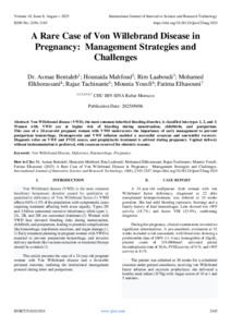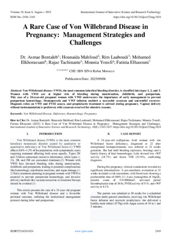 Bentaleb, Dr.Asmae and Mahfoud, Hounaida and Laaboudi, Rim and Elkhorassani, Mohamed and Tachinante, Rajae and Yousfi, Mounia and Elhasouni, Fatima (2025) A Rare Case of Von Willebrand Disease in Pregnancy: Management Strategies and Challenges. International Journal of Innovative Science and Research Technology, 10 (8): 25aug1024. pp. 2445-2447. ISSN 2456-2165