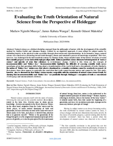 Ngimbi Muasya, Mathew and Kabata Wangai, James and Oduori Makokha, Kenneth (2025) Evaluating the Truth Orientation of Natural Science from the Perspective of Heidegger. International Journal of Innovative Science and Research Technology, 10 (8): 25aug1223. pp. 2448-2457. ISSN 2456-2165
