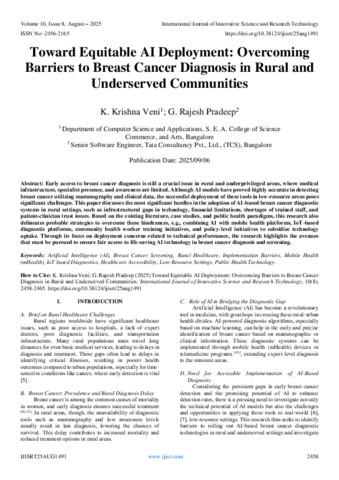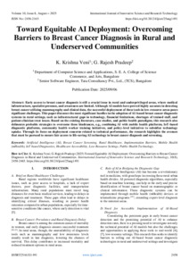 Veni, K. Krishna and Pradeep, G. Rajesh (2025) Toward Equitable AI Deployment: Overcoming Barriers to Breast Cancer Diagnosis in Rural and Underserved Communities. International Journal of Innovative Science and Research Technology, 10 (8): 25aug1491. pp. 2458-2465. ISSN 2456-2165