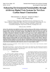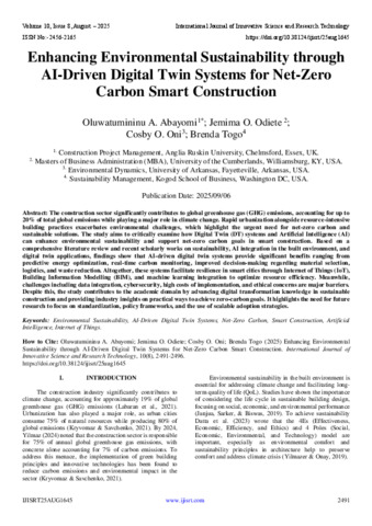 A. Abayomi, Oluwatumininu and O. Odiete, Jemima and O. Oni, Cosby and Togo, Brenda (2025) Enhancing Environmental Sustainability through AI-Driven Digital Twin Systems for Net-Zero Carbon Smart Construction. International Journal of Innovative Science and Research Technology, 10 (8): 25aug1645. pp. 2491-2496. ISSN 2456-2165