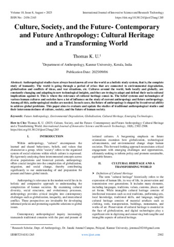 K. U., Thomas (2025) Culture, Society, and the Future- Contemporary and Future Anthropology: Cultural Heritage and a Transforming World. International Journal of Innovative Science and Research Technology, 10 (8): 25aug1265. pp. 2502-2508. ISSN 2456-2165