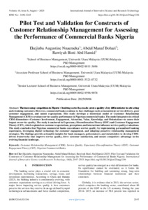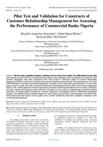 Augustine Nnaemeka, Ekejiuba and Manaf Bohari, Abdul and Abd Hamid, Rawiyah Binti (2025) Pilot Test and Validation for Constructs of Customer Relationship Management for Assessing the Performance of Commercial Banks Nigeria. International Journal of Innovative Science and Research Technology, 10 (8): 25aug1336. pp. 2547-2553. ISSN 2456-2165