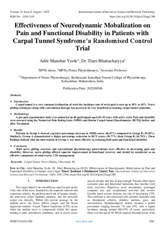 Yeole, Aditi Manohar and Bhattacharyya, Dr. Datri (2025) Effectiveness of Neurodynamic Mobalization on Pain and Functional Disability in Patients with Carpal Tunnel Syndrome’a Randomised Control Trial. International Journal of Innovative Science and Research Technology, 10 (8): 25aug1580. pp. 2562-2566. ISSN 2456-2165