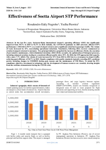 Eddy Nugroho, Rosalendro and Prawira, Yudha (2025) Effectiveness of Soetta Airport STP Performance. International Journal of Innovative Science and Research Technology, 10 (8): 25aug963. pp. 2571-2578. ISSN 2456-2165