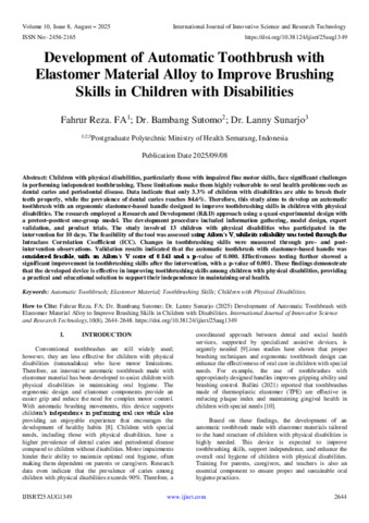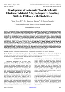 FA, Fahrur Reza. and Sutomo, Dr. Bambang and Sunarjo, Dr. Lanny (2025) Development of Automatic Toothbrush with Elastomer Material Alloy to Improve Brushing Skills in Children with Disabilities. International Journal of Innovative Science and Research Technology, 10 (8): 25aug1349. pp. 2644-2648. ISSN 2456-2165